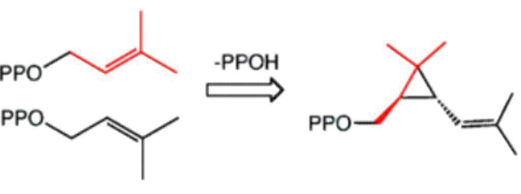 Biosynthesis: Chrysanthemic acid is derived from its pyrophosphate ester, which in turn is produced naturally from dimethylallyl diphosphate: