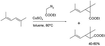 Synthesis: Chrysanthemic acid is produced industrially in a cyclopropanation reaction of a diene as a mixture of cis- and trans isomers, followed by hydrolysis of the ester: