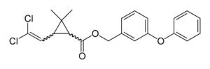 Permethrin (Biothrin, 3-Phenoxybenzyl(1RS)-cis,trans-3-(2,2-dichlorovinyl)-2,2-dimethylcyclopropanecarboxylate, CAS#52645-53-1) is a common synthetic chemical, widely used as an insecticide, acaricide, and insect repellent. It belongs to the family of synthetic chemicals called pyrethroids and functions as a neurotoxin, affecting neuron membranes by prolonging sodium channel activation. It is not known to rapidly harm most mammals or birds, but is dangerously toxic to cats and fish. In general, it has a low mammalian toxicity and is poorly absorbed by skin.